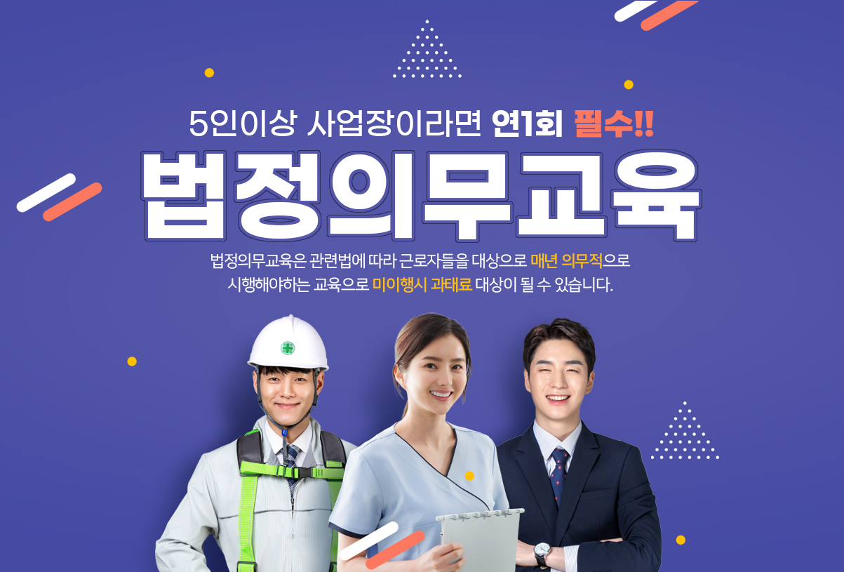 매년 1회 이상, 1시간 이상 이수해야 하는 법정의무교육은 각 기업 및 단체의 업종과 직무에 따라 다를 수 있습니다.