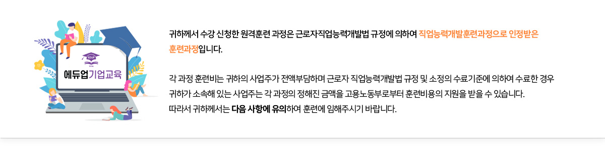 평가에는 반드시 참여하여야 하며, 훈련기간이 종료하기 전까지 모든 평가에 참여한 수료자 중 수료기준에 도달한 경우에 한하여 귀하의 사업주는